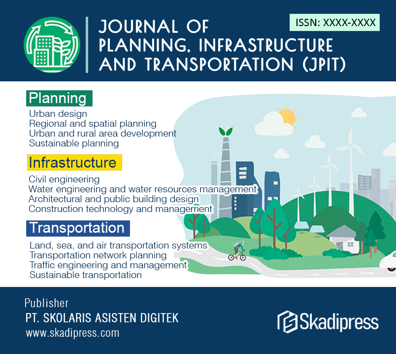 The Journal of Planning, Infrastructure, and Transportation (JPIT) is a peer-reviewed journal committed to advancing research, innovation, and best practices in sustainable planning, infrastructure, environmental engineering, and transportation.